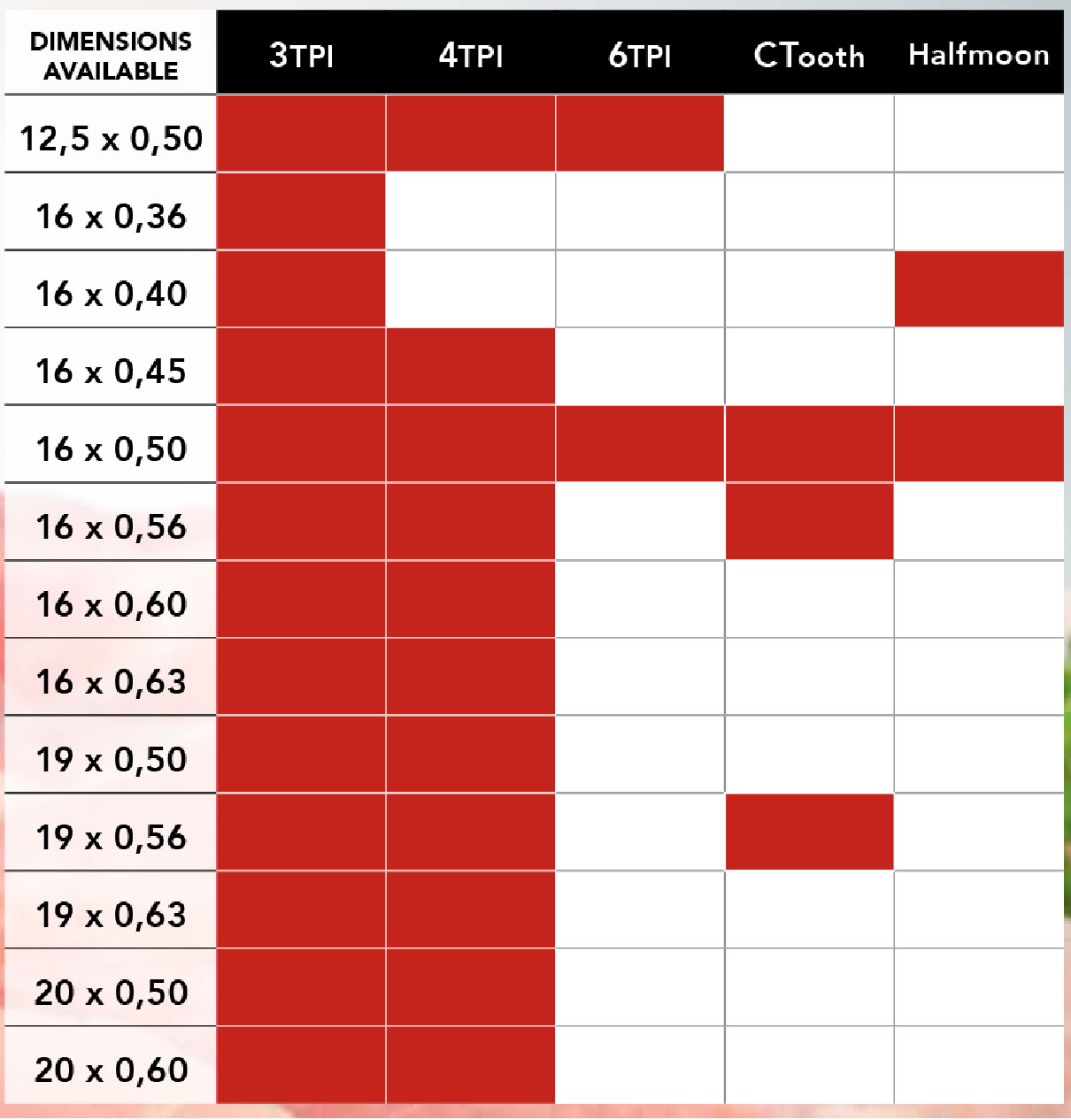 • Tooth size 10 mm • Tooth shape designed with a smaller intermediate tooth to prevent accumulation of waste in the cutting area of the main tooth, improving a better performance of the bandsaw. • Ideal for cutting frozen and fresh meat, boneless or bone-in. For getting a better cutting appearance.